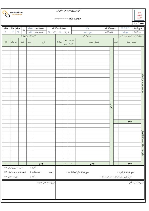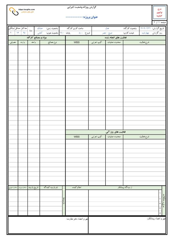 ارائه گزارش روزانه از فعالیت های پروژه و وضعیت آن یکی از اصلی ترین موارد در شرکت های پروژه محور بویژه برای پیمانکاران می باشد، در فایل پیوست گزارش دو صفحه ای و کامل از گزارش روزانه کارگاه در قالب اکسل ارائه شده است.