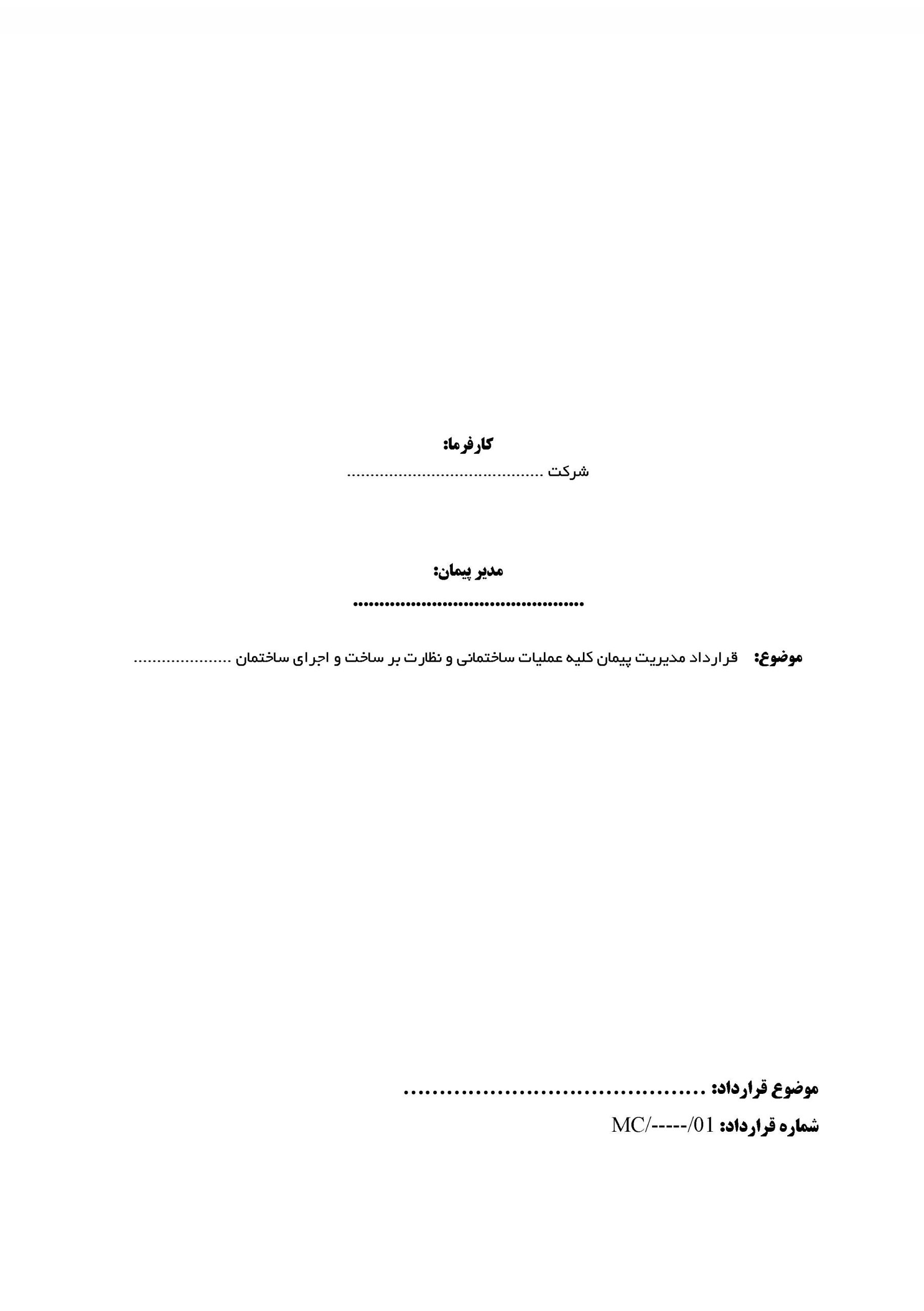 فرمت لایه باز قرارداد مدیریت پیمان یک پروژه ساختمانی در قالب فایل Word بسیار تمیز و کاربردی با امکان تغییر متن و افزودن مفاد جهت دانلود ارائه گردید.